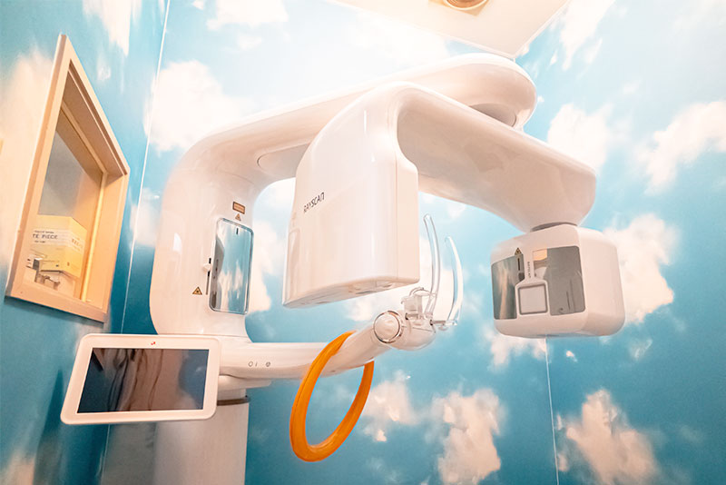 レントゲン撮影時の被ばく量を気にされる患者様も多いかと思います。当院では最新のデジタルレントゲンを導入し、従来のレントゲン撮影に比べて放射線の量を約1/10〜1/4に抑えています。また、3Dの立体映像でお口の中の撮影も可能です。